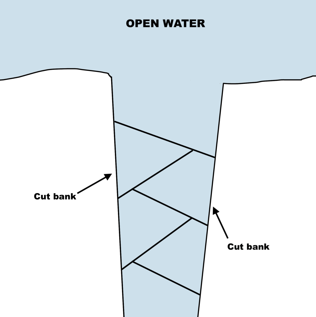This image represents the unique cutting strategy devised by Dr. Frederick Cook. The crew cut the ice between the banks in asymmetrical quadrilaterals pieces. This prevented the ice from getting wedged into place – and allowed the men to push it towards the mouth of the channel. This drawing is based up one found in Madhouse at the End of the Earth: The Belgica’s Journey into the Dark Antarctic Night by Julian Sancton.