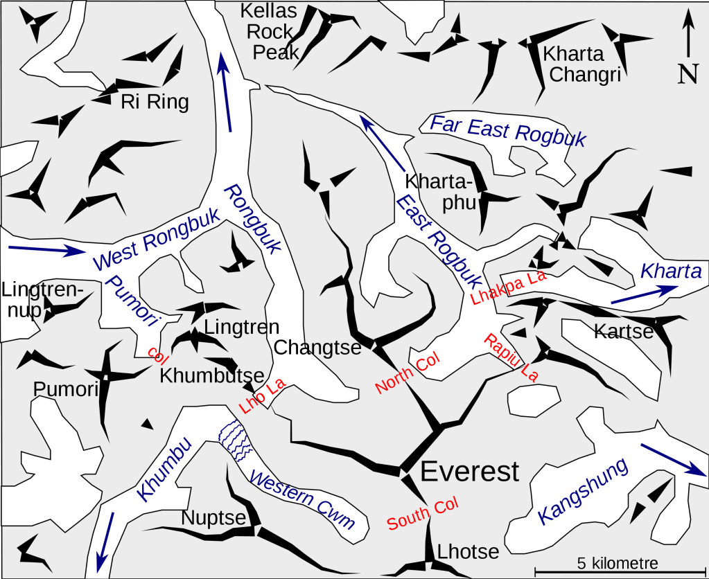 Map shows the location of the mountains, key glaciers and passes around Everest.