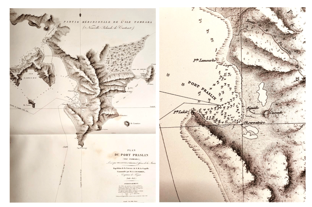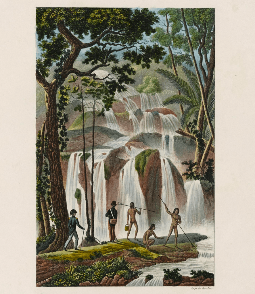 Note: in this episode, I reference that Hubert Sagnières, the author of Daring French Explorations, was able to find a waterfall described by d’Urville and Louis Antoine de Bougainville by using drawings, maps and written logs. Here are the images Sagnières used for this. The tree seen in the drawing of the falls was still there, but had died and had fallen over. All photos are from Hubert Sagnières, Daring French Explorations, Flammarion, 2024